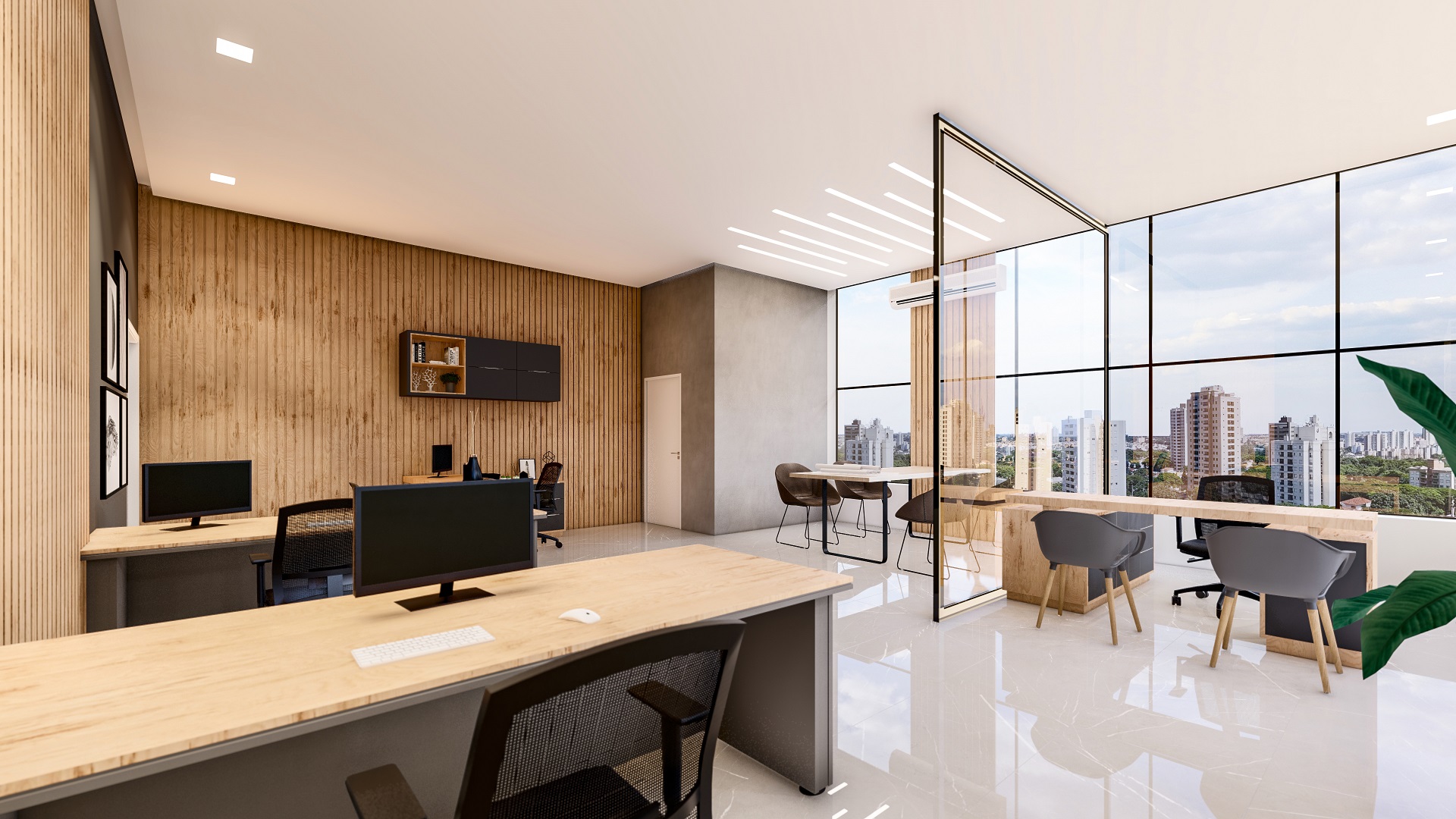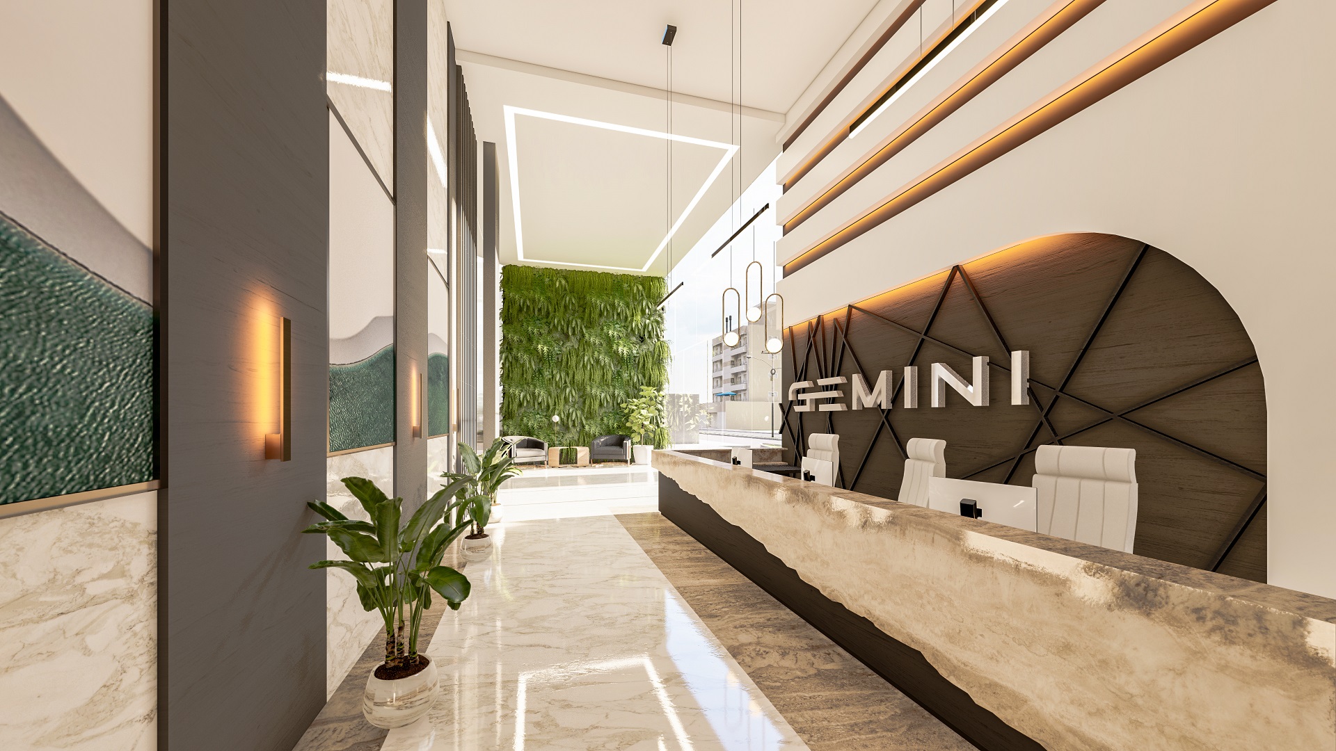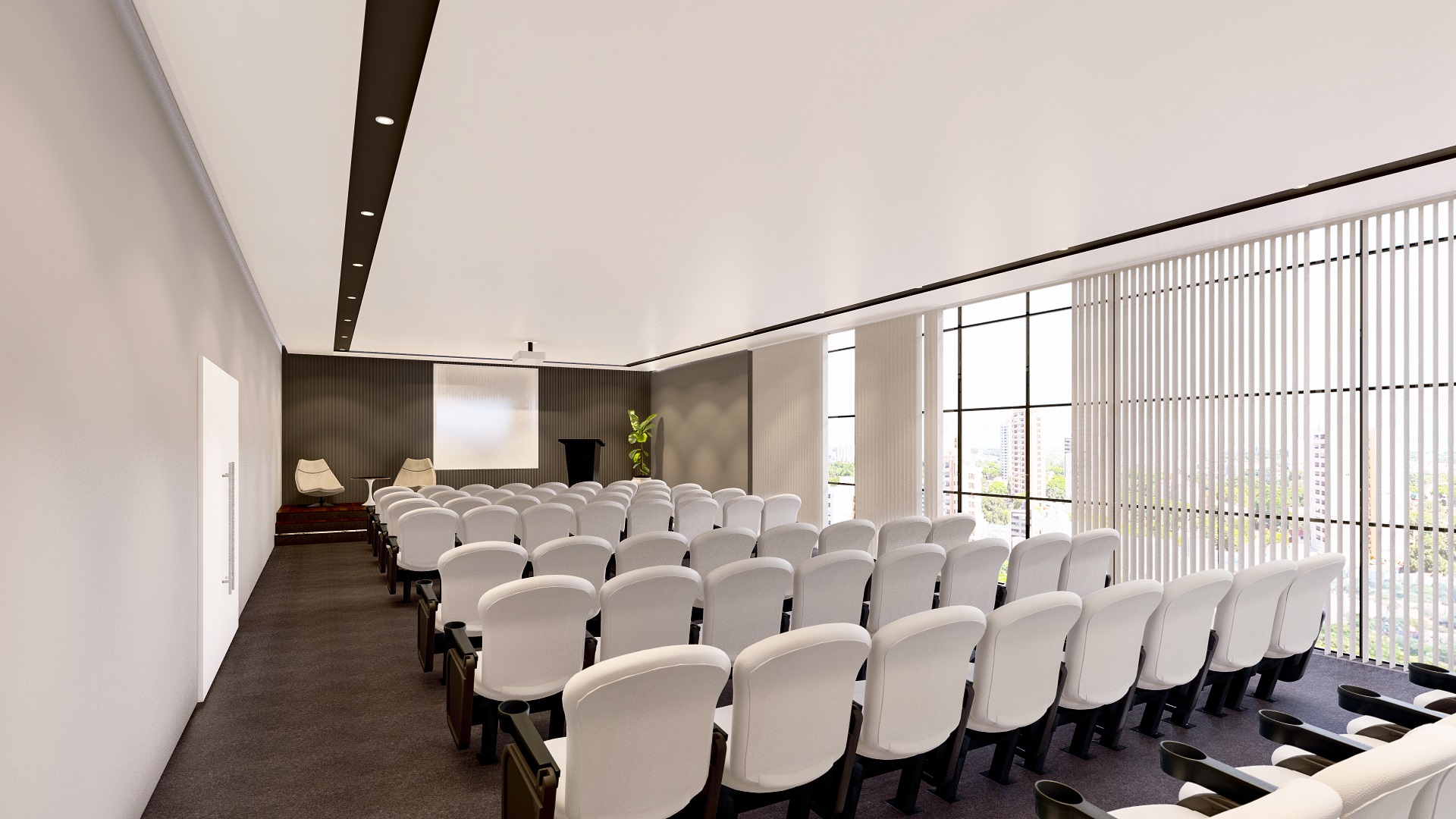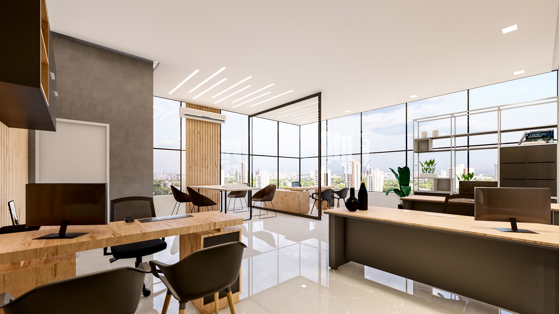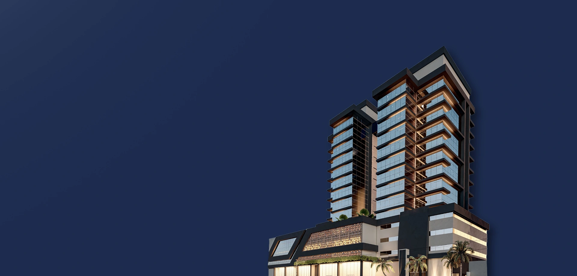 O edifício contempla duas torres, com fachadas envidraçadas, criando iluminação natural e vista privilegiada para todas as salas comerciais, além de gerar imponência e destaque para a cidade. O conceito utilizado para a ornamentação dos edifícios foi pensado para complementar e facilitar os acessos às torres, de forma prática e agradável.