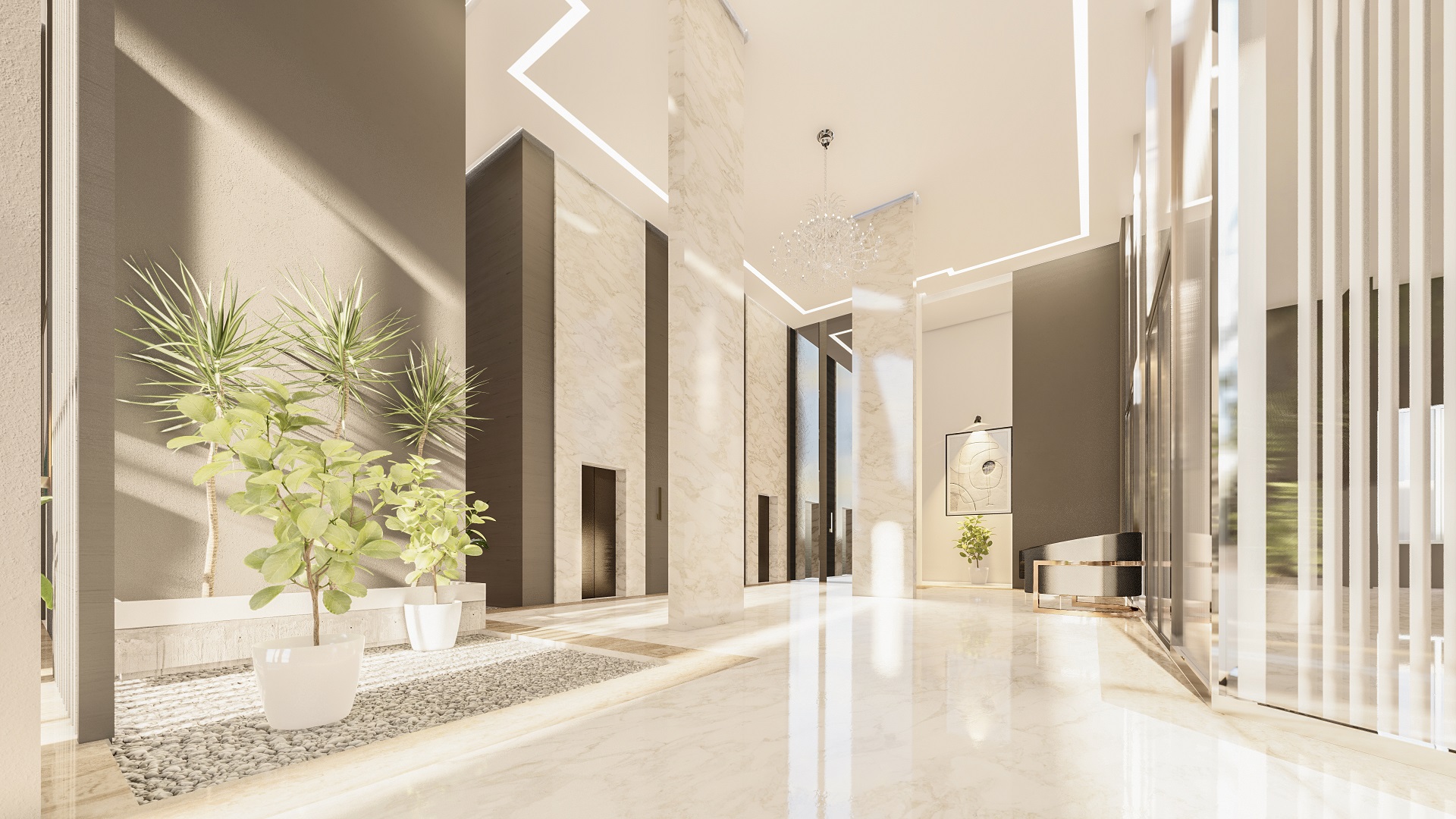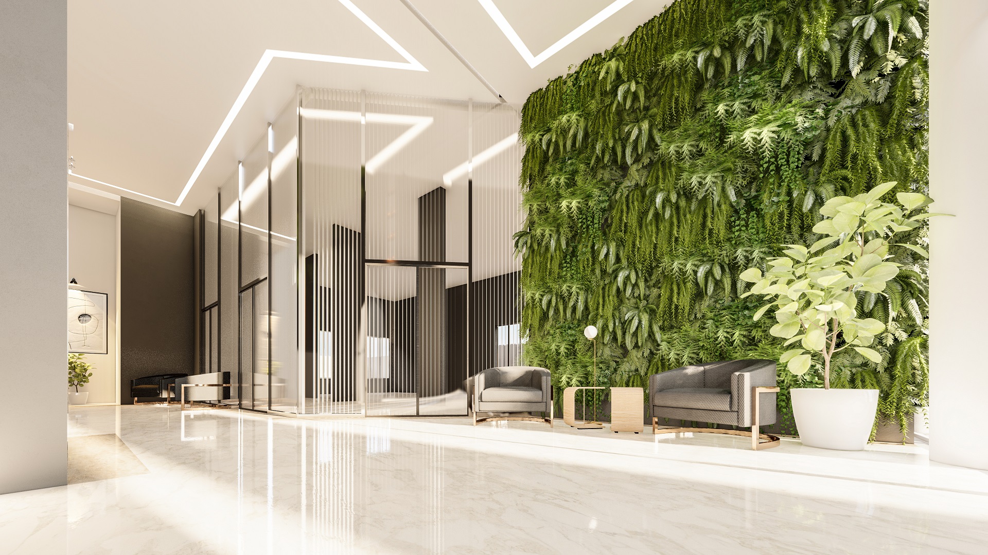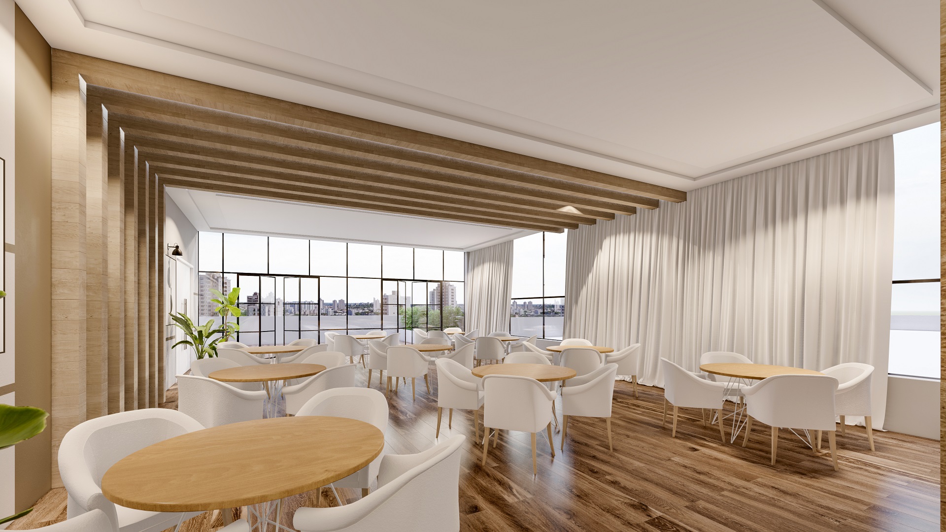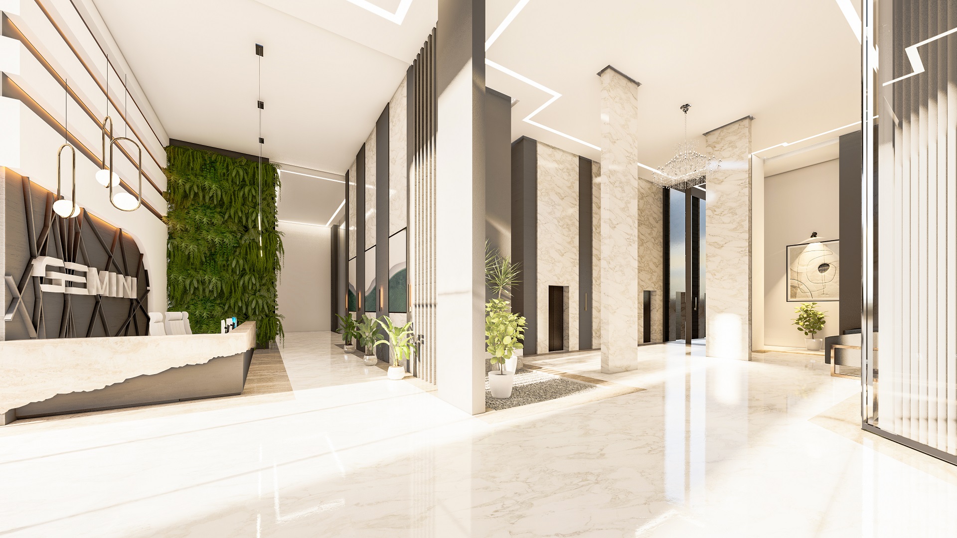 O edifício contempla duas torres, com fachadas envidraçadas, criando iluminação natural e vista privilegiada para todas as salas comerciais, além de gerar imponência e destaque para a cidade. O conceito utilizado para a ornamentação dos edifícios foi pensado para complementar e facilitar os acessos às torres, de forma prática e agradável.